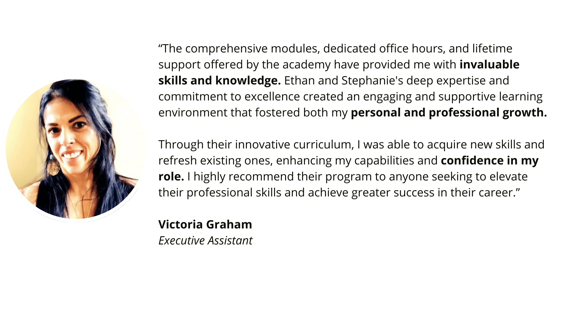 Stephanie: My career has shown me the transformative power of soft skills—emotional intelligence, situational awareness, and an unwavering work ethic are what set a top-level EA apart. Mentoring is my passion, and I bring that into every aspect of this course. My approach focuses on fostering a growth mindset, resilience, and a deep sense of self-worth, because those are the foundations of a thriving career.