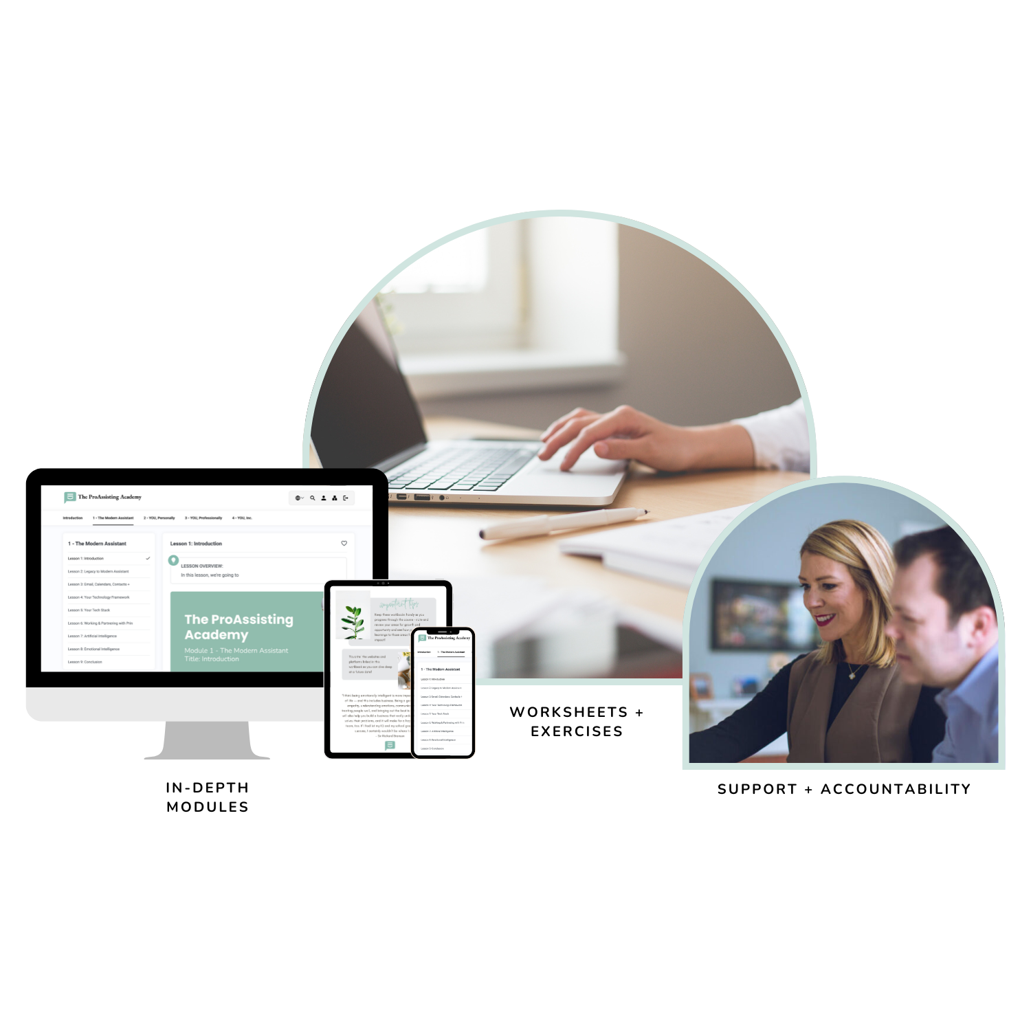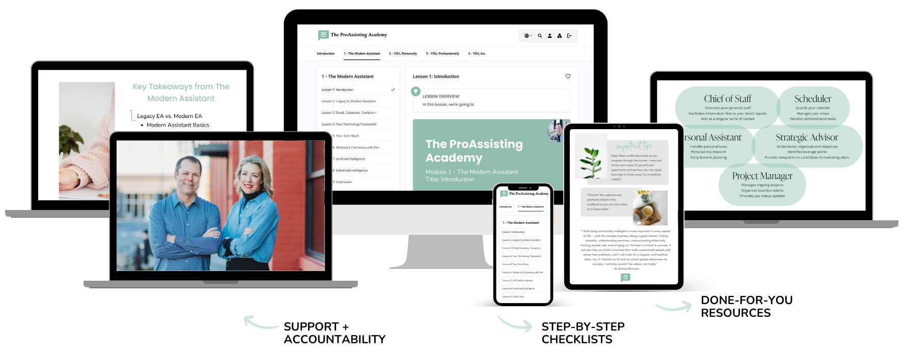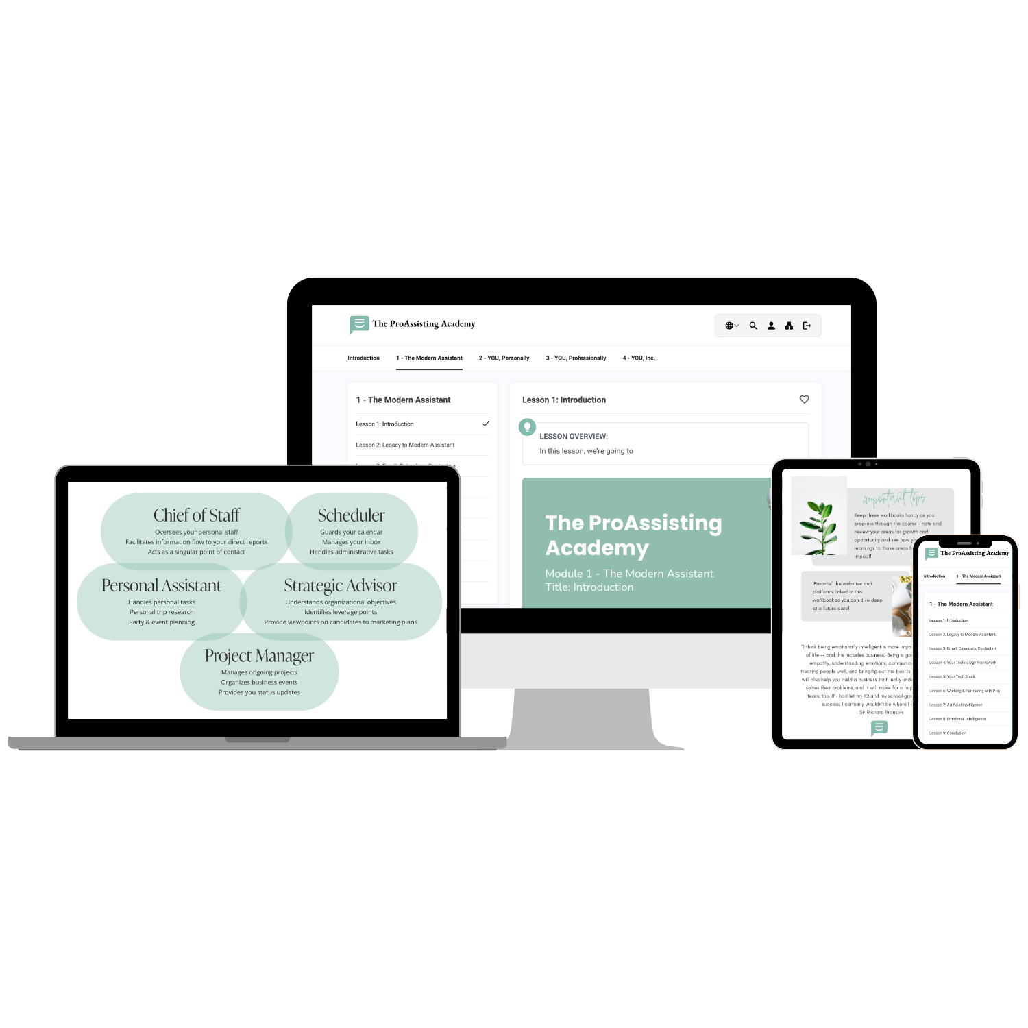 The ProAssisting Academy is tailored for career-minded executive assistants who want to elevate their careers. That means securing higher-paying roles, mastering the integration of technology into your work, or even transitioning into a business owner of your own EA service business.